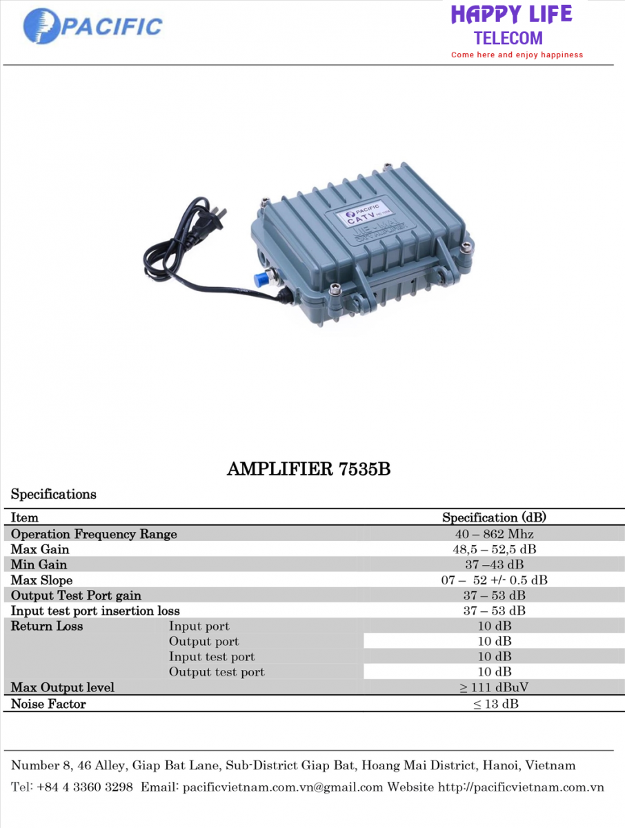 - Khuếch đại truyền hình cáp Pacific 7535 dùng tốt nhất từ 1 đến 30 tivi, cáp đi âm tường xa khoảng 60 mét, tín hiệu mạnh mẽ, độ dao động tần số từ 5dB đến 30dB, sản phẩm độc quyền bởi http://pacificvietnam.com.vn